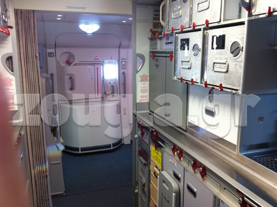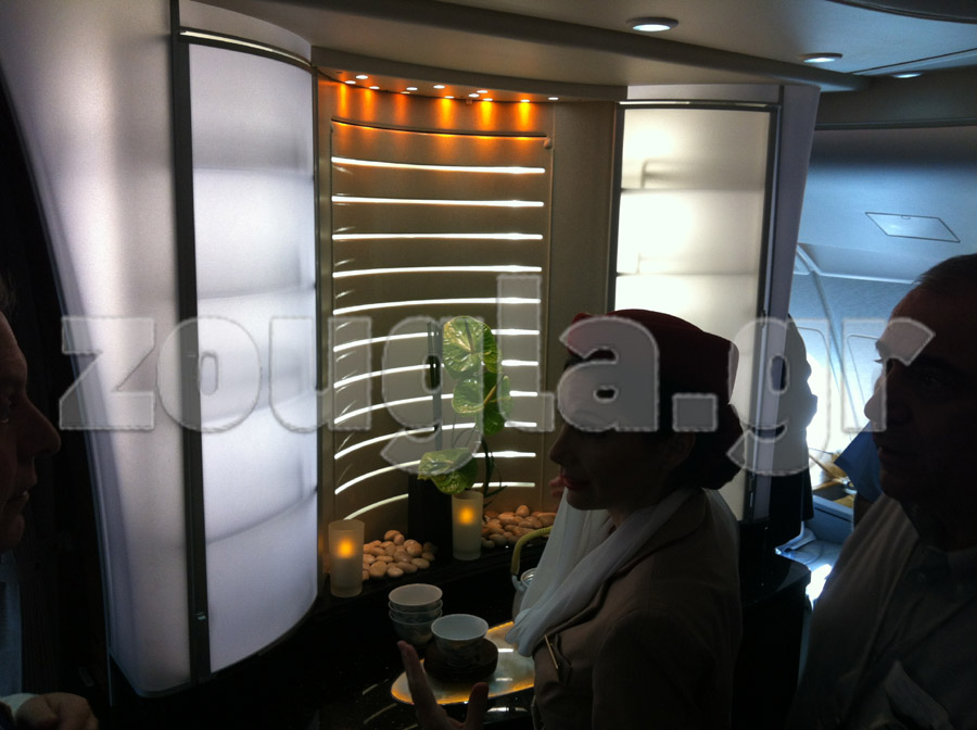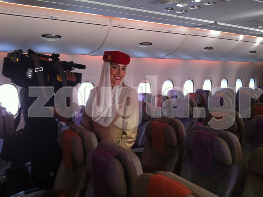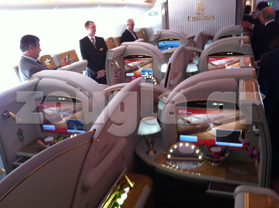 Εκεί ήταν και η zougla.gr που ξεναγήθηκε στους διαδρόμους του Α380. Να σημειώσουμε ότι πρόκειται για ένα διώροφο (!) αεροσκάφος το οποίο είναι εφοδιασμένο με όλες τις ανέσεις, τόσο όσον αφορά τα καθίσματα αλλά και όσον αφορά την ποιότητα του ταξιδιού. Όπως διαπιστώσαμε το εν λόγω αεροσκάφος που μπορεί να φιλοξενήσει συνολικά 517 επιβάτες ( 427 στην οικονομική θέση, 76 στη διακεκριμένη και 14 στην πρώτη θέση) είναι ένα πολυτελές ξενοδοχείο που δεν θυμίζει σε τίποτα ένα κλασσικό αεροπλάνο και ιδίως όταν βρίσκεσαι στον.. πάνω όροφο.