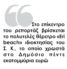 Στο επίκεντρο του ρεπορτάζ βρίσκεται το πολυτελές θέρετρο «Eri beach» ιδιοκτησίας του Σ. Κ., το οποίο χρωστά στο Δημόσιο πέντε εκατομμύρια ευρώ, τα οποία όμως, ο επιχειρηματίας, ουδέποτε κατέβαλε.