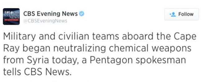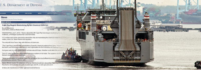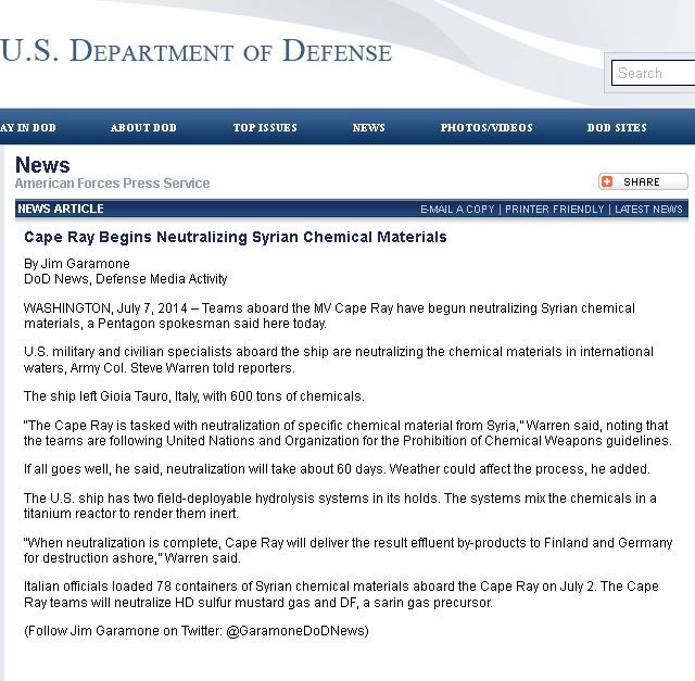 «Με βάση τις φειδωλές πληροφορίες που λαμβάνουμε, καθώς όλοι οι επίσημοι φορείς και η κυβέρνηση παίζουν κρυφτό με τους πολίτες, το πείραμα της υδρόλυσης των χημικών του πολέμου στη Συρία μπαίνει στην τελευταία φάση του, με την άμεση φόρτωσή τους στο Cape Ray από την Ιταλία και τον απόπλου του από το λιμάνι της Καλαβρίας σε λίγες ημέρες. Στη διαδικασία αυτή, που θα συμμετέχει το πολεμικό ναυτικό των ΗΠΑ καθώς και ένα ελληνικό υποβρύχιο, ενεργό ρόλο θα παίξει και η ΝΑΤΟϊκή βάση της Σούδας.