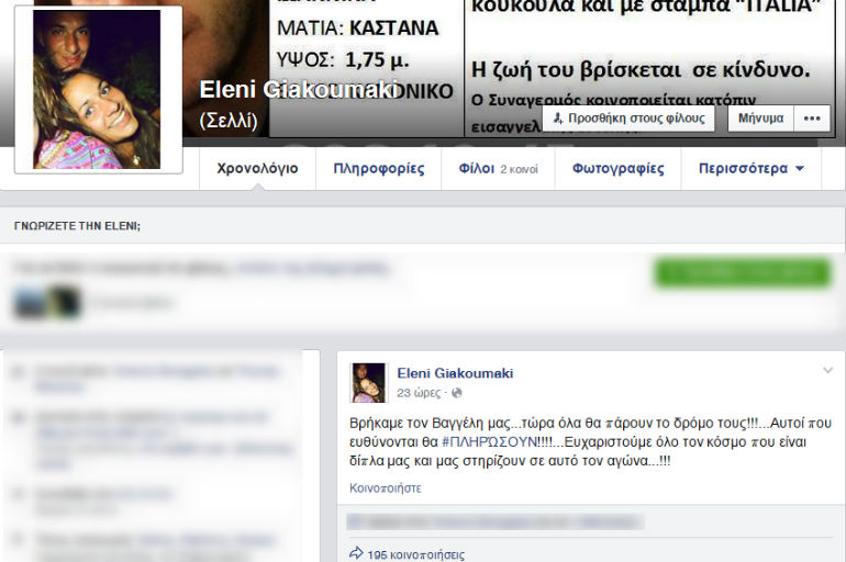 «Βρήκαμε τον Βαγγέλη μας… Τώρα όλα θα πάρουν τον δρόμο τους! Αυτοί που ευθύνονται θα πληρώσουν. Ευχαριστούμε όλο τον κόσμο που είναι δίπλα μας και μας στηρίζουν σε αυτό τον αγώνα!», ανέφερε η αδερφή του 20χρονου σπουδαστή στον λογαριασμό της στο Facebook.