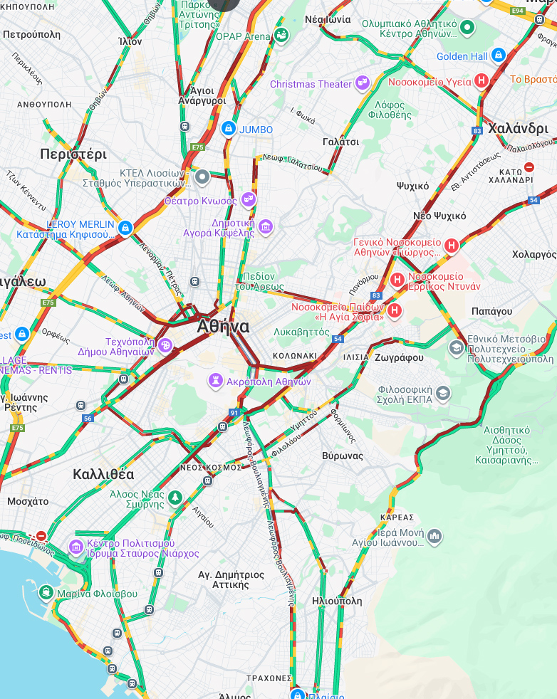 Πιο συγκεκριμένα, πλήττεται το κέντρο της Αθήνας οι λεωφόροι Αρδηττού, Σταδίου, Πανεπιστημίου, Τσαλδάρη και Αγίου Κωνσταντίνου είναι στο «κόκκινο».
