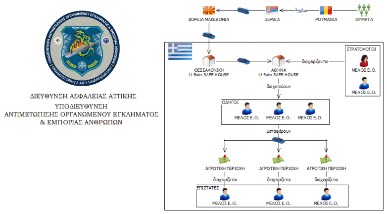 Σε έρευνα που πραγματοποιήθηκε στα σπίτια των συλληφθέντων μελών βρέθηκαν και κατασχέθηκαν ταξιδιωτικά έγγραφα που είχαν παρακρατηθεί και σημειώσεις που αφορούσαν τις κινήσεις των εργατών, παραστατικά μεταφοράς χρημάτων από τους εργάτες προς την οργάνωση και το χρηματικό ποσό των 950 ευρώ. Σε ένα από τα θύματα εμπορίας λόγω της εργασιακής του εκμετάλλευσης παρασχέθηκε αρωγή και προστασία από την ανωτέρω υπηρεσία, με τη συνδρομή των Μη Κυβερνητικών Οργανώσεων σε ζητήματα εμπορίας ανθρώπων «Α21» και «OUR GREECE». Οι συλληφθέντες οδηγήθηκαν στον Εισαγγελέα Πρωτοδικών Αθηνών με κατηγορίες για εγκληματική οργάνωση, εμπορία ανθρώπων και παράβαση του κώδικα περί μετανάστευσης ενώ έχουν ταυτοποιηθεί και αναζητούνται άλλα πέντε μέλη της οργάνωσης, ηλικίας από 33 έως 61 ετών.