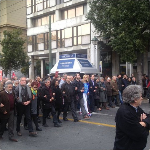 Στην πρώτη γραμμή του μπλοκ της Λαϊκής Ενότητας, πιασμένοι αγκαζέ με τον Παναγιώτη Λαφαζάνη, η Ραχήλ Μακρή, η Νάντια Βαλαβάνη, ο Δημήτρης Στρατούλης, ο Κώστας Ήσυχος κ.ά.