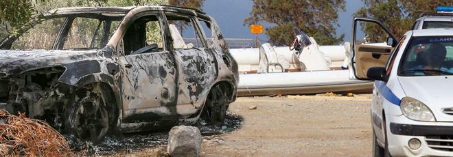 Αφού παράτησαν το φουσκωτό στη συνέχεια διέφυγαν με δύο αυτοκίνητα. Το πρώτο όχημα διαφυγής των ληστών εντοπίστηκε καμένο στην παραλία της Αγίας Σωτήρας, περίπου 4 χλμ. από το υποκατάστημα της τράπεζας.