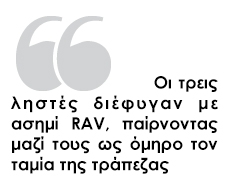 Πρόκειται για τρεις αγνώστους, οι οποίοι κρατούσαν πιστόλια και είχαν καλυμμένα τα χαρακτηριστικά του προσώπου τους. Αστυνομικές πηγές αναφέρουν ότι ήταν μεταμφιεσμένοι και μιλούσαν ελληνικά. Οι δράστες εισέβαλαν λίγο πριν από τις 13.55 στο υποκατάστημα της Εθνικής Τράπεζας στα Άσπρα Σπίτια Βοιωτίας στην περιοχή του Διστόμου. Αφού άρπαξαν περίπου 300.000 ευρώ, πήραν μαζί τους έναν ταμία της τράπεζας και επιβιβάστηκαν σ’ ένα μαύρο RAV, με το οποίο και διέφυγαν προς άγνωστη κατεύθυνση. Στο υποκατάστημα της Εθνικής εκείνη την ώρα βρίσκονταν 4-5 υπάλληλοι.