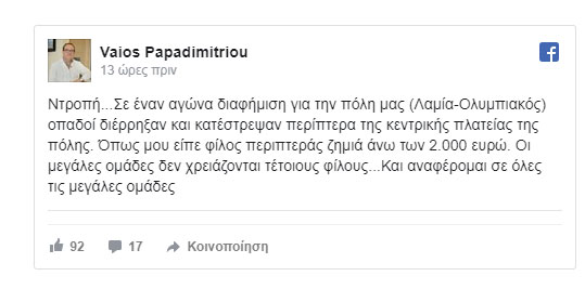 «Ντροπή…Σε έναν αγώνα διαφήμιση για την πόλη μας (Λαμία-Ολυμπιακός) οπαδοί διέρρηξαν και κατέστρεψαν περίπτερα της κεντρικής πλατείας της πόλης. Όπως μου είπε φίλος περιπτεράς ζημιά άνω των 2.000 ευρώ. Οι μεγάλες ομάδες δεν χρειάζονται τέτοιους φίλους…Και αναφέρομαι σε όλες τις μεγάλες ομάδες…», σχολίασε σε ανάρτησή του ο Λαμιώτης γιατρός Βάιος Παπαδημητρίου.