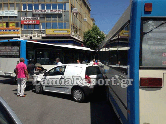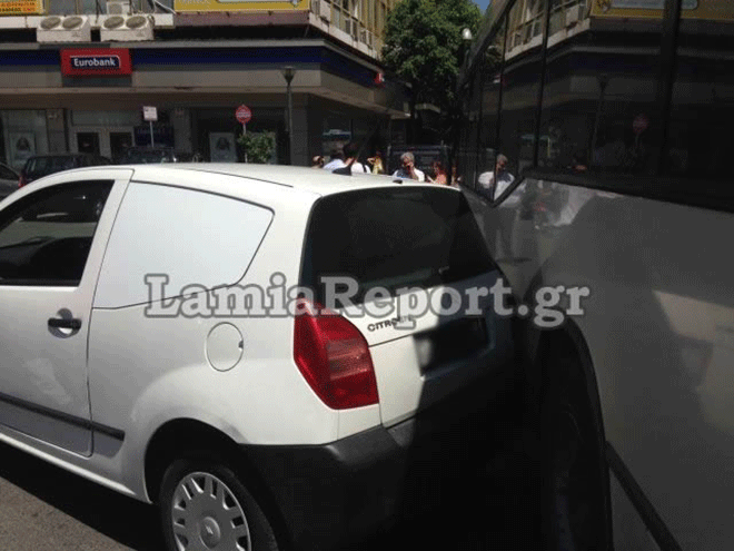 Ξαφνικά, το αυτοκίνητο κάνει… όπισθεν και περνώντας ανάμεσα από πεζούς, αυτοκίνητα, δίκυκλα καταλήγει όπως το βλέπετε, πάνω στο αστικό λεωφορείο που ήταν σταματημένο μπροστά στην Εθνική Τράπεζα.