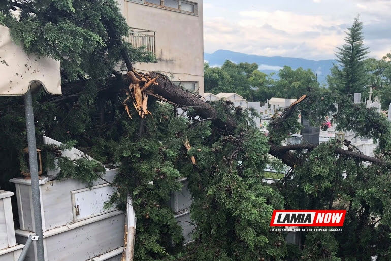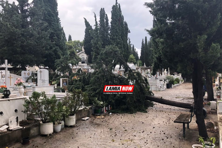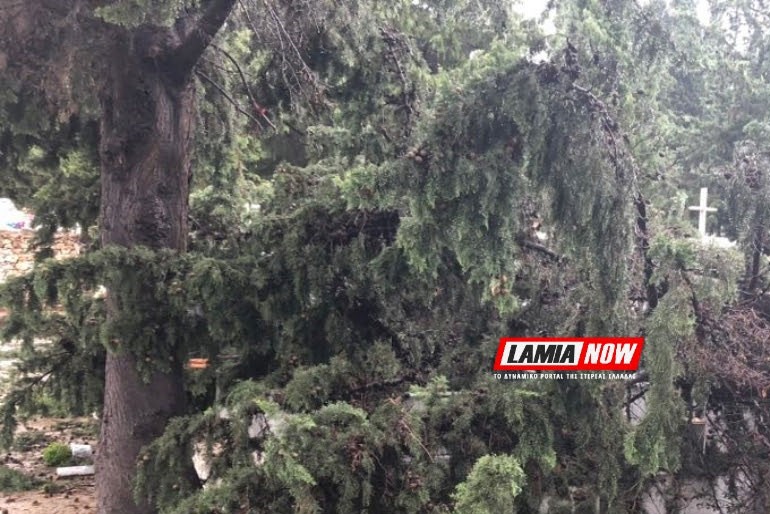 Η έντονη βροχόπτωση δεν μπορούσε να μην δημιουργήσει προβλήματα και στο Νεκροταφείο Λαμίας στην Ξηριώτισσα. Τέσσερα κυπαρίσσια έσπασαν από την καταιγίδα πέφτοντας και καταστρέφοντας μνήματα.