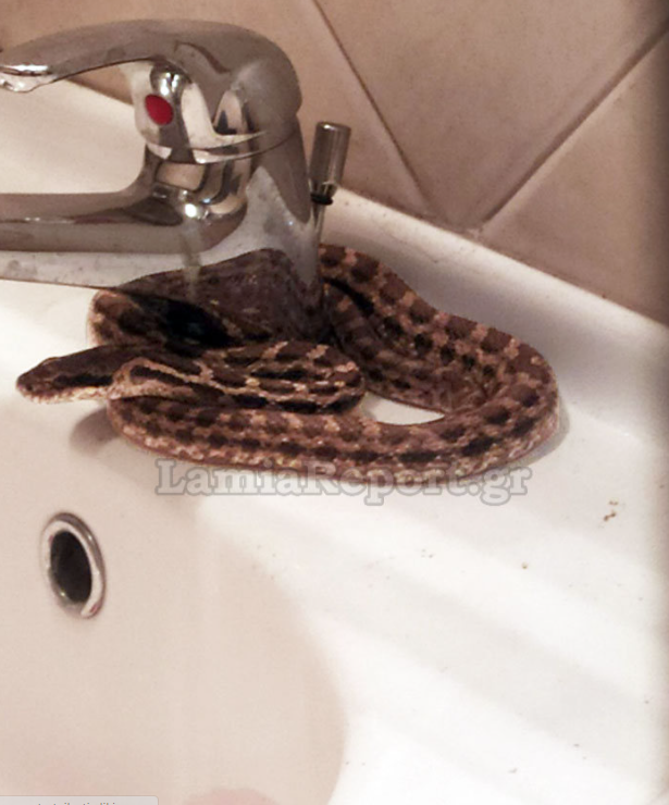 Το μεγάλο φίδι, είχε καταφύγει στην τουαλέτα του γύρω από τη βρύση, αναζητώντας προφανώς λίγη δροσιά.