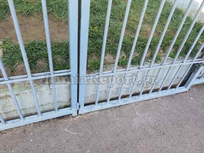Προσωρινά η πόρτα – κάγκελο ασφαλίστηκε με τρεις βαριές αλυσίδες και λουκέτα, ενώ ακουμπά πλέον και σταθερά στο έδαφος.