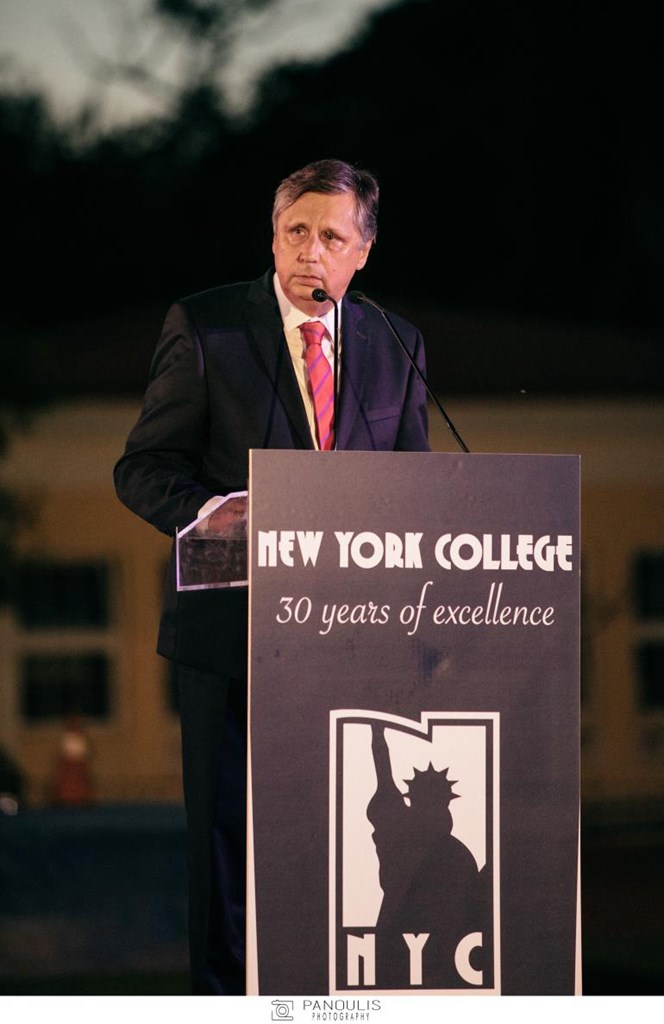 Ο τ. Πρωθυπουργός της Τσεχικής Δημοκρατίας Jan Fischer, κατά τη διάρκεια της τελετής, απευθυνόμενος στους αποφοίτους μίλησε για την Ευρωπαϊκή οικονομία και τα επιτεύγματα της Τσεχικής Οικονομίας και αναφέρθηκε στις προοπτικές απασχόλησης που έχουν οι απόφοιτοι του New York College για μια παγκόσμια καριέρα.