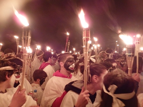 Η σκοτεινή πόλη (σ.σ.: Αφού τα φώτα είχαν σβήσει) φωτίστηκε από τους αναμμένους πυρσούς των εκατοντάδων λαμπαδηφόρων που πλημμύρισαν τα στενά του Κάστρου και στη συνέχεια τις κεντρικές οδούς της πόλης.