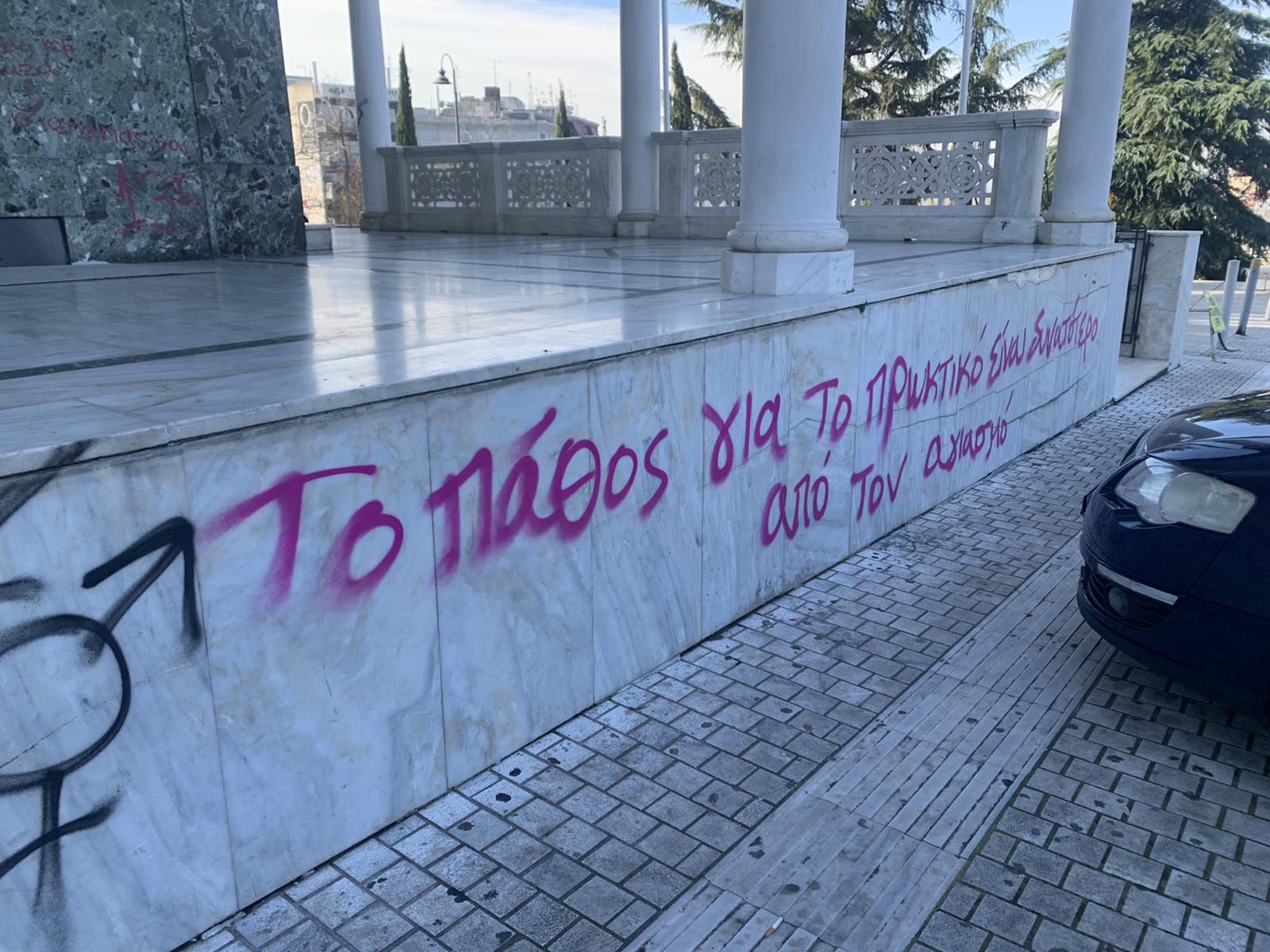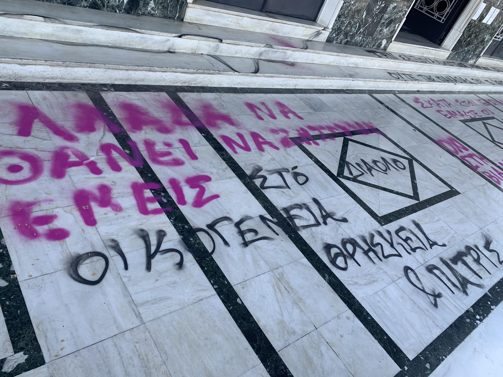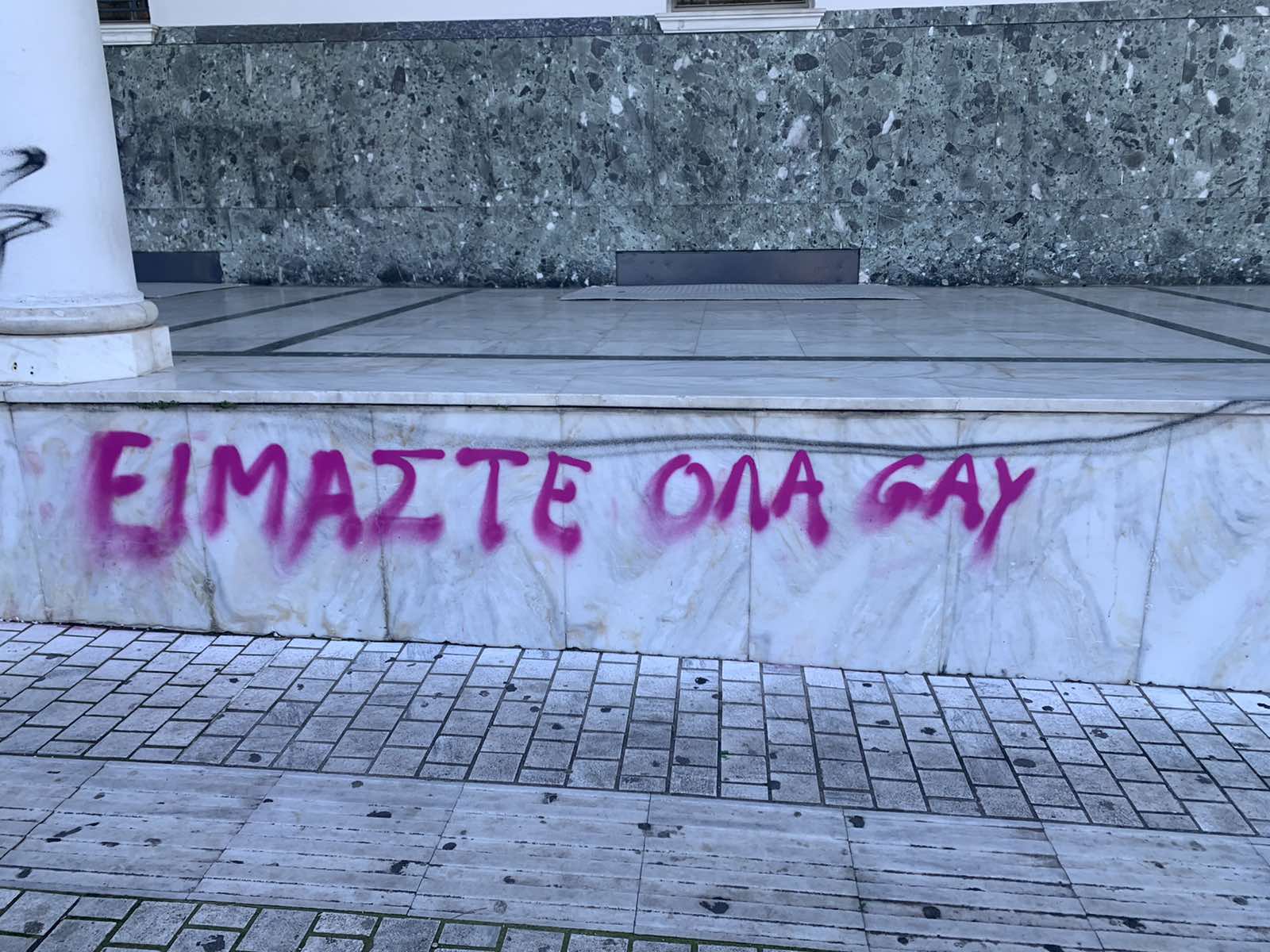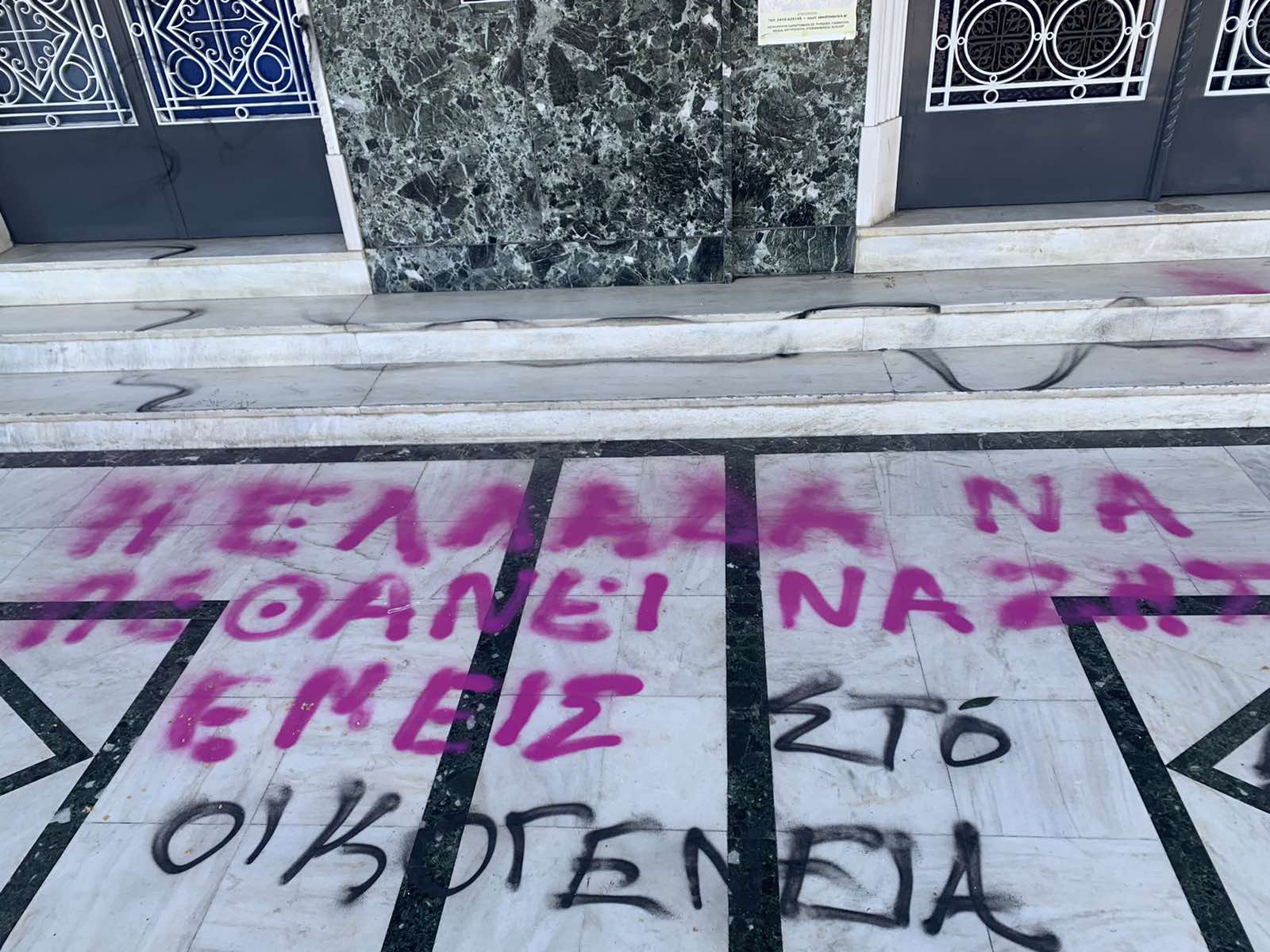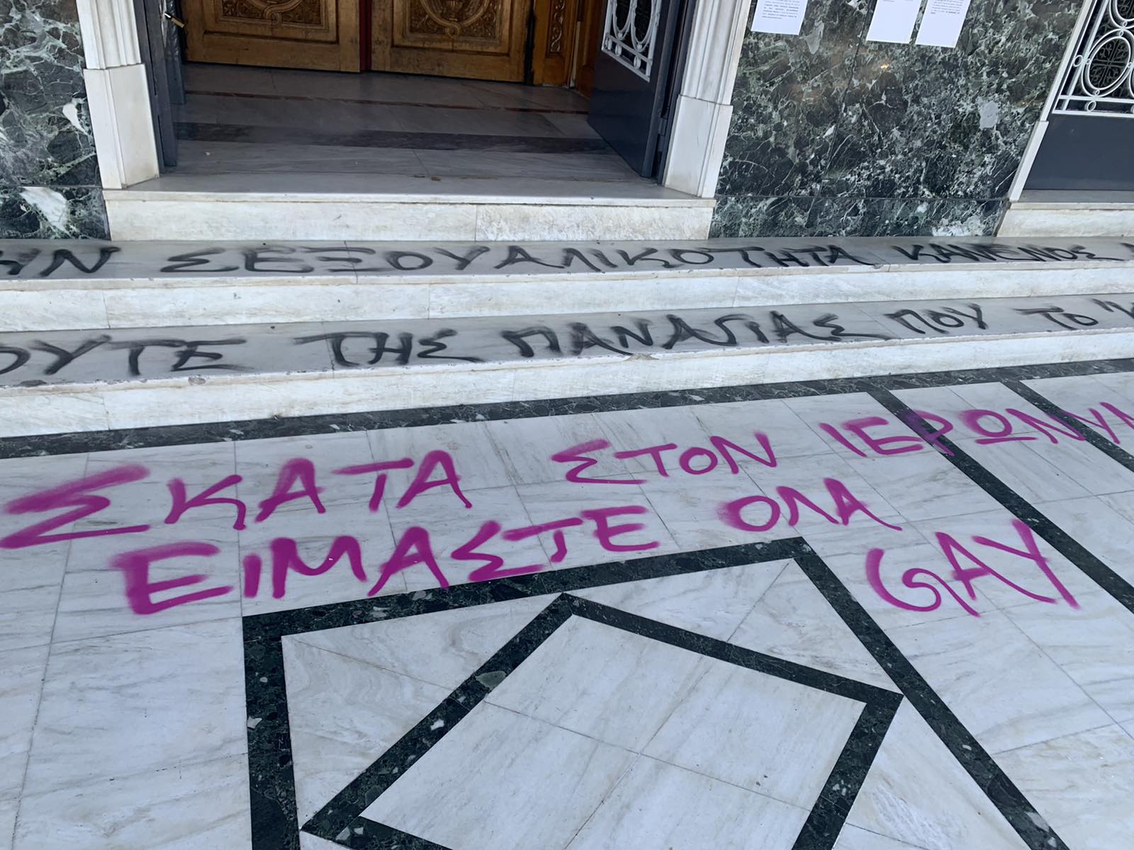 Μπροστά από την κεντρική είσοδο έγραψαν χυδαιότητες κατά του μητροπολίτη Λαρίσης ενώ στα σκαλοπάτια διακωμωδούν το πρόσωπο της Παναγίας.
