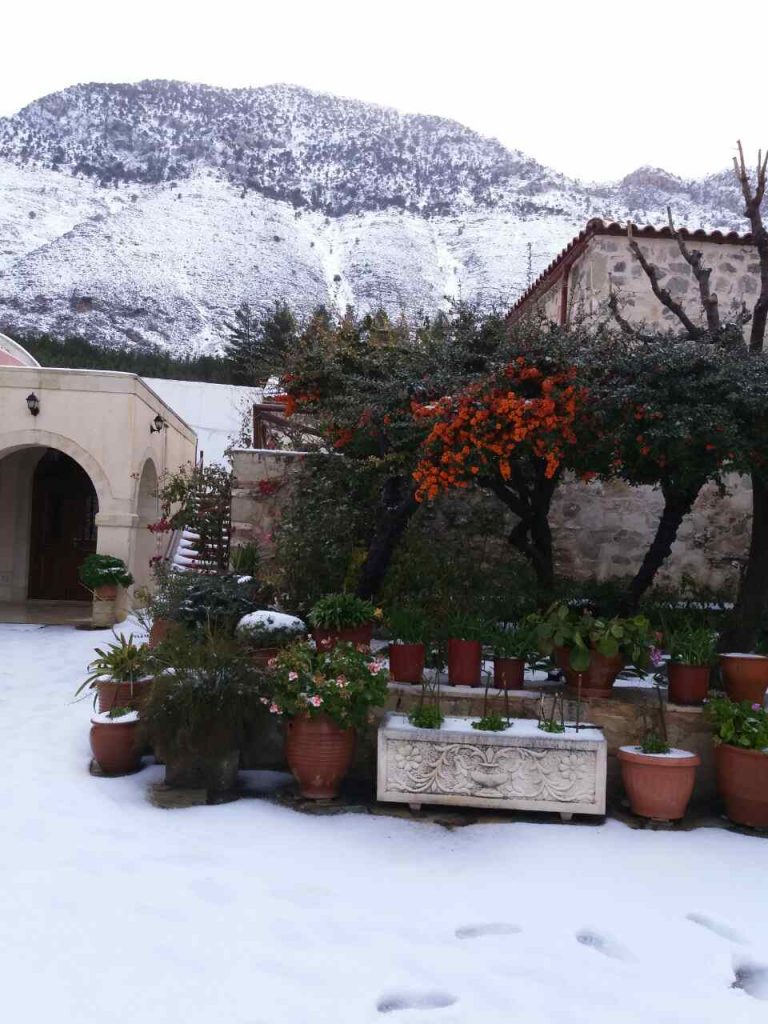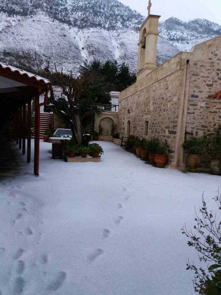 Στα “λευκά” ντύθηκε για άλλη μια χρονιά η Ιερά Μονή της Αγίας Ειρήνης, που βρίσκεται νότια του Κρουσώνα στο Ηράκλειο.