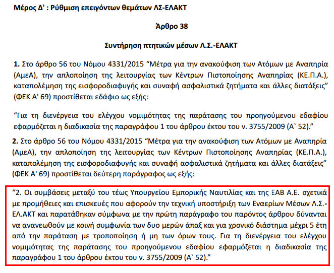 Όπως θα δείτε παρακάτω, στο άρθρο 38 αναφέρεται ότι η σύμβαση του υπουργείου με την ΕΑΒ μπορεί να παραταθεί για τα επόμενα πέντε χρόνια.