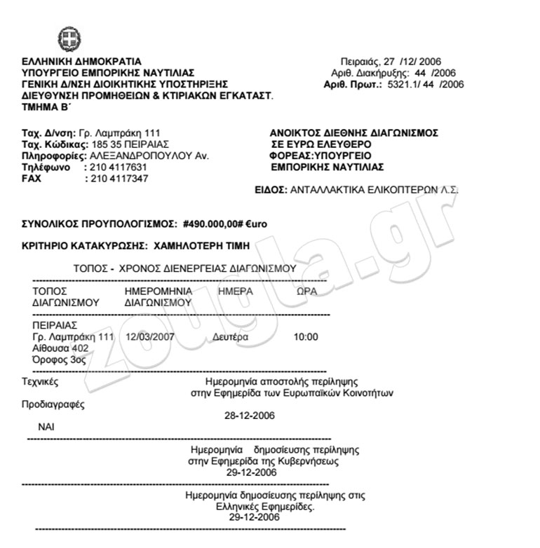Ωστόσο, από έγγραφα που βρίσκονται στη διάθεση της ηλεκτρονικής μας εφημερίδας και αφορούν σε δύο διεθνείς διαγωνισμούς για ανταλλακτικά ελικοπτέρων του Λιμενικού, προκύπτει ότι το παραπάνω πιστοποιητικό είναι απαραίτητο.