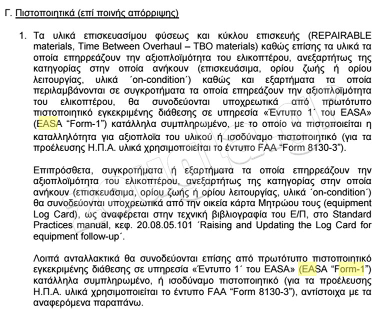 Ειδικότερα, όπως προκύπτει από το ρεπορτάζ, προκειμένου η ΕΑΒ να προβεί στη συντήρηση των ελικοπτέρων του Λ.Σ. θα πρέπει να διαθέτει το πιστοποιητικό EASA Part 145, το οποίο δεν φέρεται να έχει.