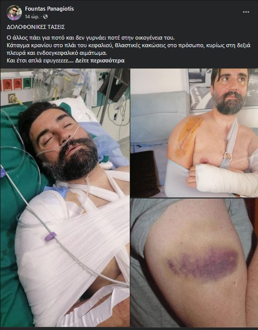 Με ανάρτηση που πραγματοποίησε στο Facebook, ο 42χρονος κάνει λόγο πως ζει από θαύμα, καθώς δέχτηκε πολλαπλά χτυπήματα στο κεφάλι. Ενδεικτικά της βαναυσότητας της επίθεσης που δέχτηκε είναι και τα σημάδια στο σώμα του, όπως φαίνονται στις φωτογραφίες.