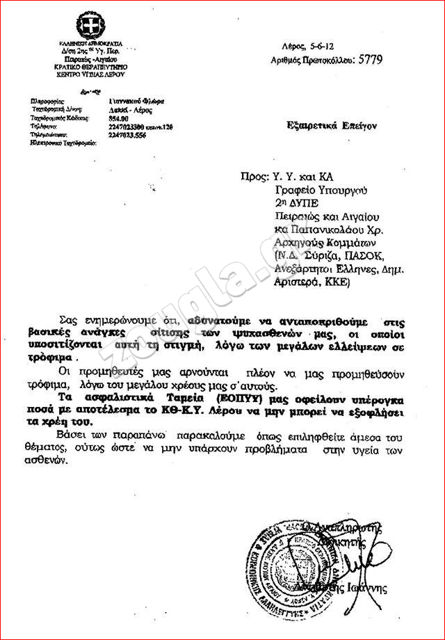 Έκκληση απευθύνουν οι υπεύθυνοι του Κρατικού Θεραπευτηρίου- Κ.Υ. Λέρου προς τους αρμοδίους, καθώς καθίσταται πλέον σχεδόν αδύνατη η σίτιση των «ψυχασθενών οι οποίοι υποσιτίζονται», όπως αναφέρεται χαρακτηριστικά σε επιστολή που απέστειλαν με την ένδειξη «Εξαιρετικά Επείγον» προς το γραφείο του υπουργού Υγείας.