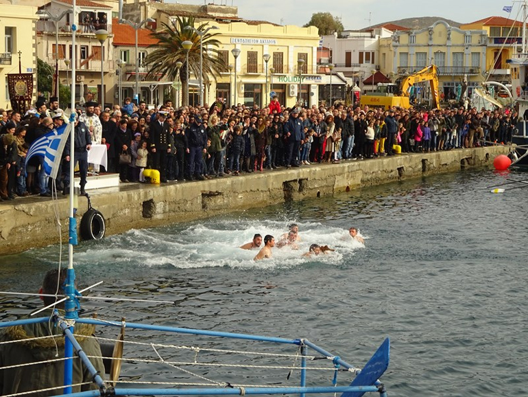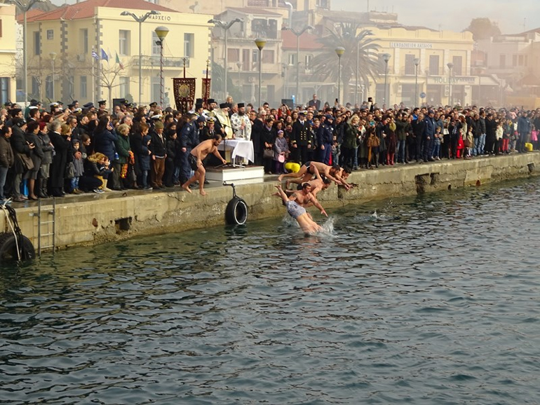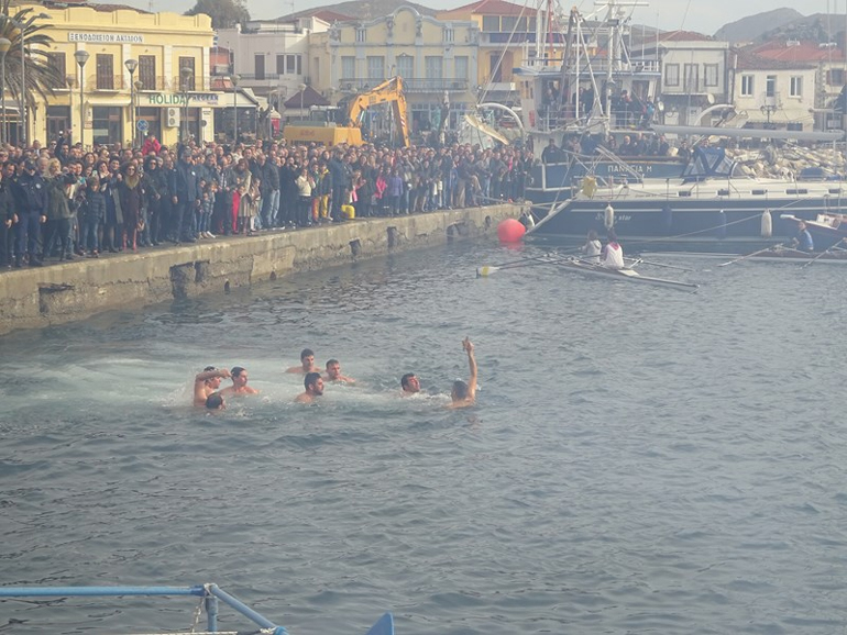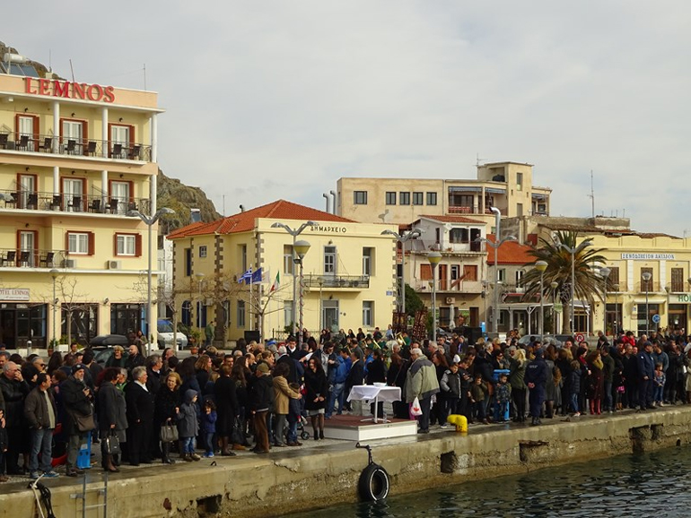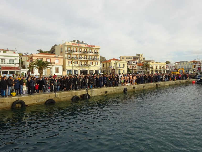 Με ευλάβεια και κατάνυξη εορτάστηκαν και φέτος τα Θεοφάνια στη Λήμνο. Στη Μύρινα, μετά την τέλεση της Θείας Λειτουργίας και την Ακολουθία του Μεγάλου Αγιασμού στον Ι.Μ. Ναό της Αγίας Τριάδας, ακολούθησε η τελετή κατάδυσης του Τιμίου Σταυρού στο παλιό λιμάνι, χοροστατούντος του Σεβασμιότατου Μητροπολίτη Λήμνου και Αγίου Ευστρατίου κ.κ. Ιεροθέου, παρουσία των αυτοδιοικητικών αρχών, της στρατιωτικής ηγεσίας, των σωμάτων ασφαλείας, κατοίκων του Δήμου καθώς και επισκεπτών.