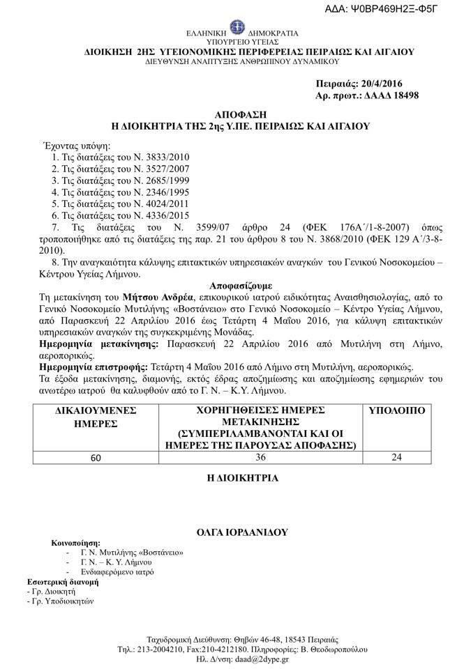 Την προσωρινή μετακίνηση επικουρικού ιατρού, ειδικότητας Αναισθησιολογίας, από το Γενικό Νοσοκομείο Μυτιλήνης «Βοστάνειο» στο Γενικό Νοσοκομείο – Κέντρο Υγείας Λήμνου αποφάσισε η διοίκηση της 2ης Υγειονομικής Περιφέρειας Πειραιώς και Αιγαίου.