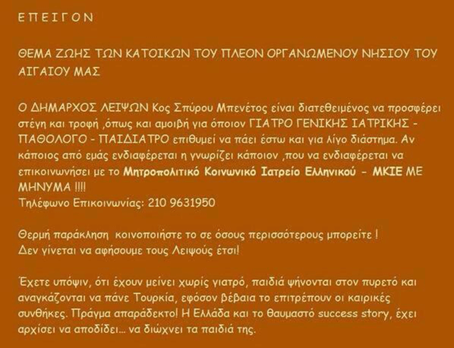 Σύμφωνα με την ανακοίνωση, ο δήμαρχος προσφέρει στέγη και τροφή, όπως και αμοιβή σε όποιον γιατρό γενικής ιατρικής-παθολόγο-παιδίατρο επιθυμεί να μεταβεί στο νησί έστω και για περιορισμένο χρονικό διάστημα.
