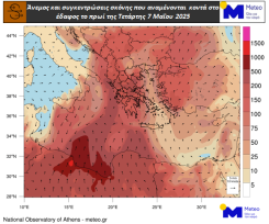 Σύμφωνα με τα τελευταία προγνωστικά δεδομένα του meteo.gr / Εθνικού Αστεροσκοπείου Αθηνών, υψηλές θερμοκρασίες και αυξημένες συγκεντρώσεις σκόνης αναμένονται τουλάχιστον έως την Παρασκευή (9/5).