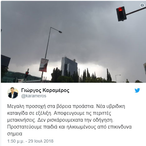 Με ανάρτηση του στο twitter, ο αντιπεριφερειάρχης Αττικής, Γιώργος Καραμέρος συνέστησε στους πολίτες να δείξουν μεγάλη προσοχή στα βόρεια προάστια και να αποφεύγουν τις περιττές μετακινήσεις.