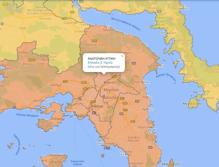 Πατήστε πάνω στην παρακάτω εικόνα για να μεταβείτε στη σελίδα του χάρτη υγειονομικής ασφάλειας και στη συνέχεια επιλέξτε την περιοχή που επιθυμείτε για να δείτε αναλυτικά τον βαθμό επιτήρησης και τα ειδικά μέτρα που ισχύουν.