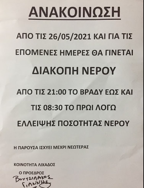Καθημερινές και πολύωρες διακοπές νερού καταγγέλλουν κάτοικοι και φορείς της κοινότητας Λιχάδα στην Εύβοια, σύμφωνα με όσα αναφέρονται σε δημοσίευμα της τοπικής ιστοσελίδας eviatoday.