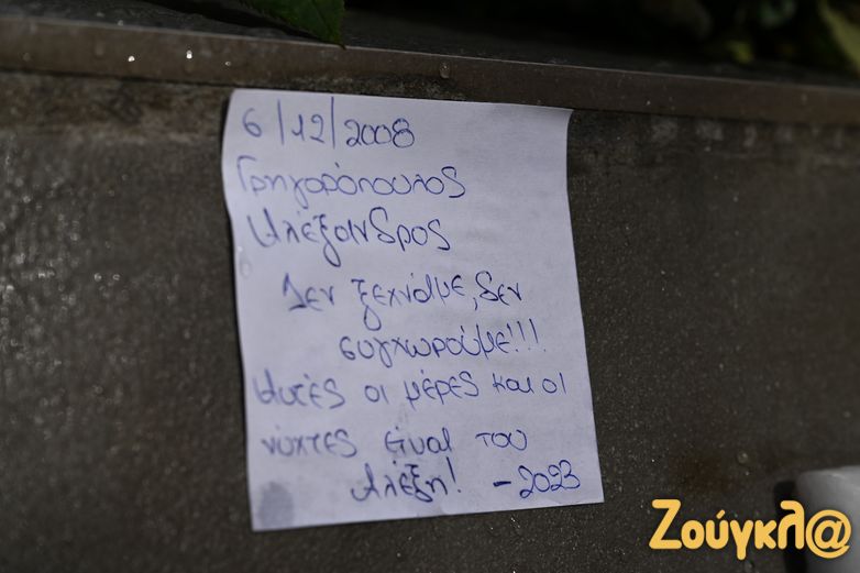 Λουλούδια και σημειώματα αφήνουν πολίτες από νωρίς το πρωί της Τετάρτης στο σημείο όπου δολοφονήθηκε σαν σήμερα 6 Δεκεμβρίου το 2008 ο Αλέξανδρος Γρηγορόπουλος. «Δεν ξεχνάμε δεν συγχωρούμε» γράφει ένα από τα μηνύματα που έχουν αφήσει στο μνημείο στη συμβολή των οδών Τζαβέλα και Μεσολογγίου, όπου άφησε την τελευταία του πνοή ο 15χρονος.