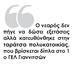Τραγικός ήταν ο επίλογος της ζωής ενός 18χρονου μαθητή από τα Γιαννιτσά Πέλλας. Ο νεαρός έφυγε το πρωί από το σπίτι του προκειμένου να συμμετάσχει στις Πανελλαδικές και να εξεταστεί στο μάθημα της Νεοελληνικής Γλώσσας. Ωστόσο, αντί να κατευθυνθεί προς το 1ο ΓΕΛ της περιοχής, ανέβηκε στον 4ο όροφο οικοδομής δίπλα στο σχολικό συγκρότημα και πήδηξε στο κενό.
