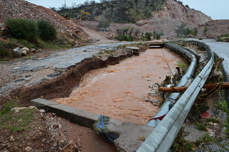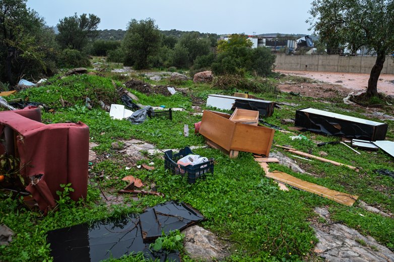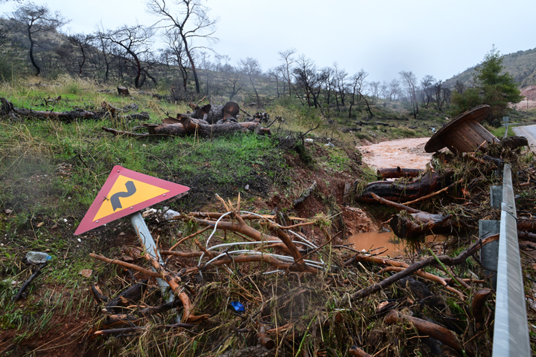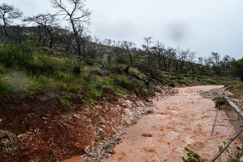 Η κακοκαιρία Byron έπληξε τη Μάνδρα, μετέτρεψε δρόμους σε ποτάμια και μετέφερε λάσπες και φερτά υλικά μέσα σε οικισμούς.