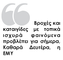 Σύμφωνα με την πρόγνωση της Εθνικής Μετεωρολογικής Υπηρεσίας (ΕΜΥ), βροχές και καταιγίδες με τοπικά ισχυρά φαινόμενα, που μέχρι το τέλος της ημέρας θα περιοριστούν στο Ανατολικό και Νότιο Αιγαίο, στην Ανατολική Μακεδονία, στη Θράκη και σε περιοχές της Δυτικής Ελλάδας, καθώς και πυκνές χιονοπτώσεις κυρίως στα ορεινά και κατά τόπους θυελλώδεις ανέμους θα κυριαρχήσουν σήμερα, πρώτη ημέρα της Σαρακοστής.
