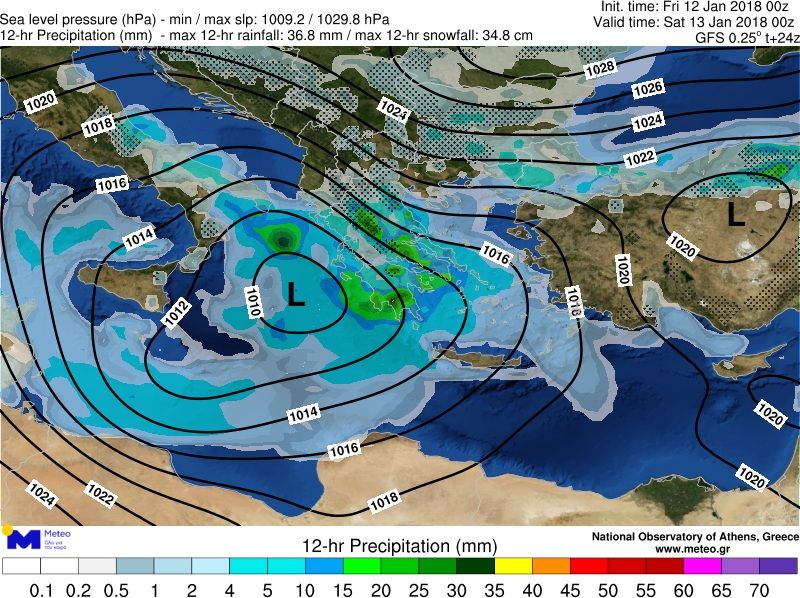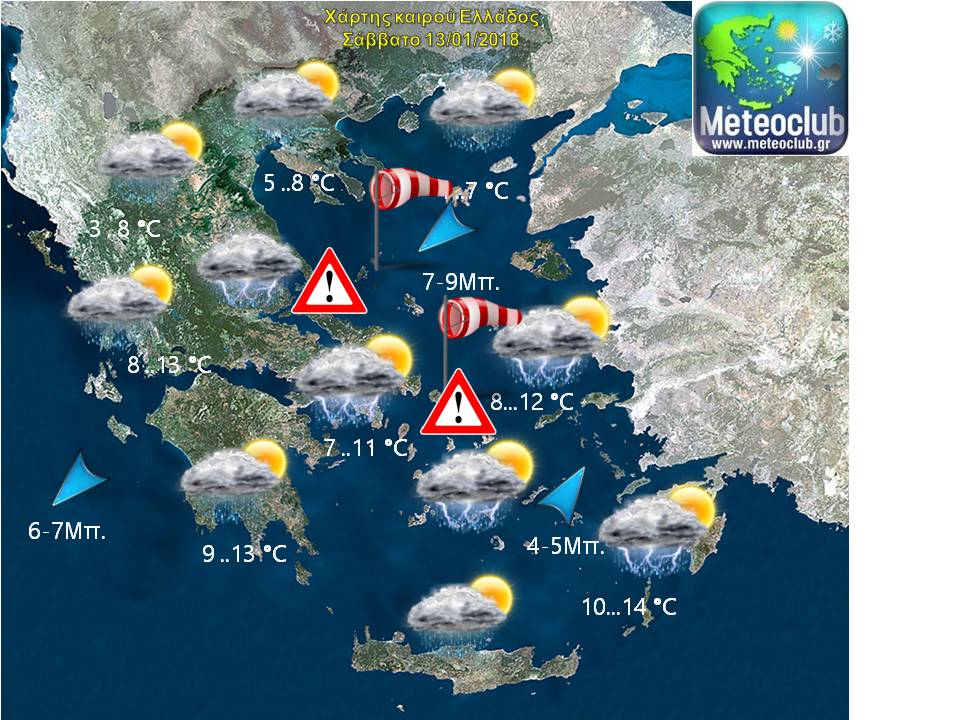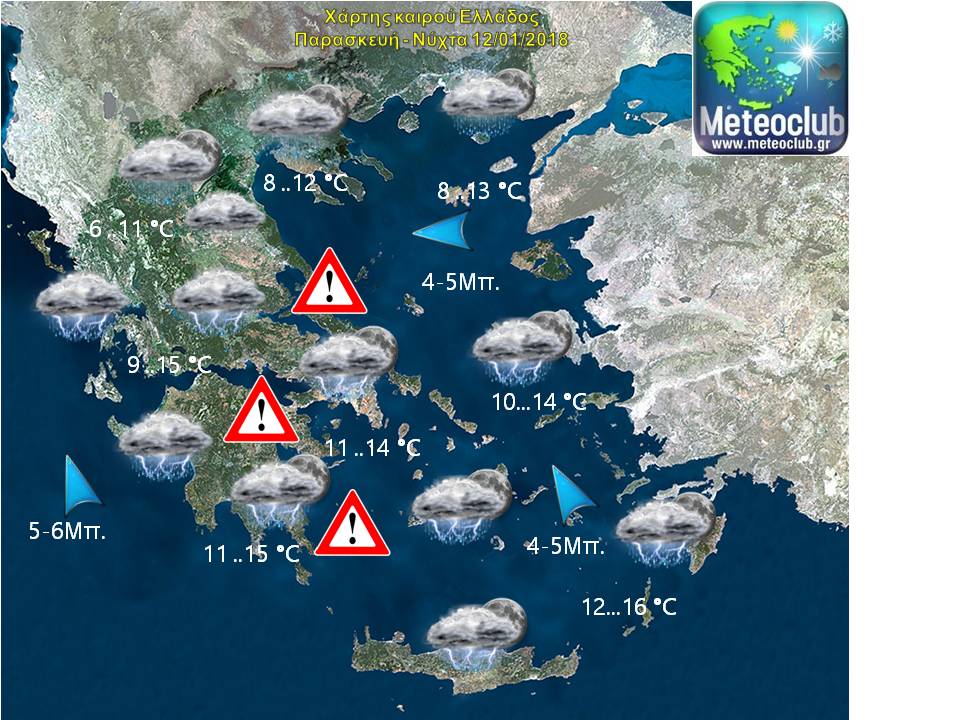 Ήδη βροχοπτώσεις/καταιγίδες που εκδηλώνονται στο Ιόνιο θα επεκταθούν στις περισσότερες περιοχές της χώρας και το βράδυ στα νότια θα ενταθούν σημαντικά (κυρίως στο Νότιο Ιόνιο και στην Πελοπόννησο). Πυκνές χιονοπτώσεις θα εκδηλωθούν στα ηπειρωτικά ορεινά, ενώ παροδικές χιονοπτώσεις μικρότερης έντασης θα επηρεάσουν περιοχές της Βόρειας Ελλάδας με υψόμετρο έως 700 περίπου μέτρα (πιθανόν και χαμηλότερα στα σύνορα με τη Βουλγαρία). Οι βόρειοι άνεμοι στο Βόρειο Αιγαίο θα ενισχυθούν σταδιακά στα 7 μποφόρ, ενώ στα υπόλοιπα πελάγη θα πνέουν νότιοι άνεμοι με εντάσεις έως 6 και πιθανόν τοπικά 7 μποφόρ.