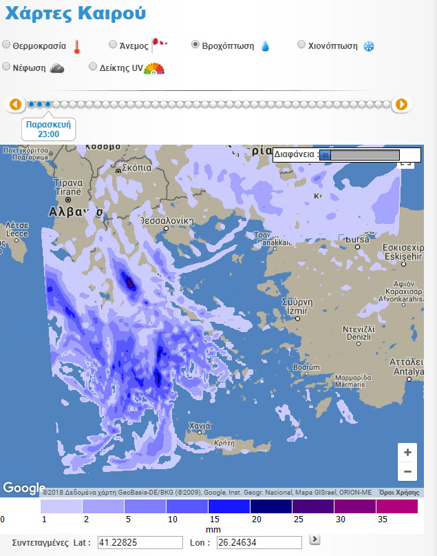 Ο χάρτης που ακολουθεί απεικονίζει τη θέση του Θησέα και την κατανομή του υετού (βροχοπτώσεις και χιονοπτώσεις) κατά το δεύτερο μισό της Παρασκευής 12/01.