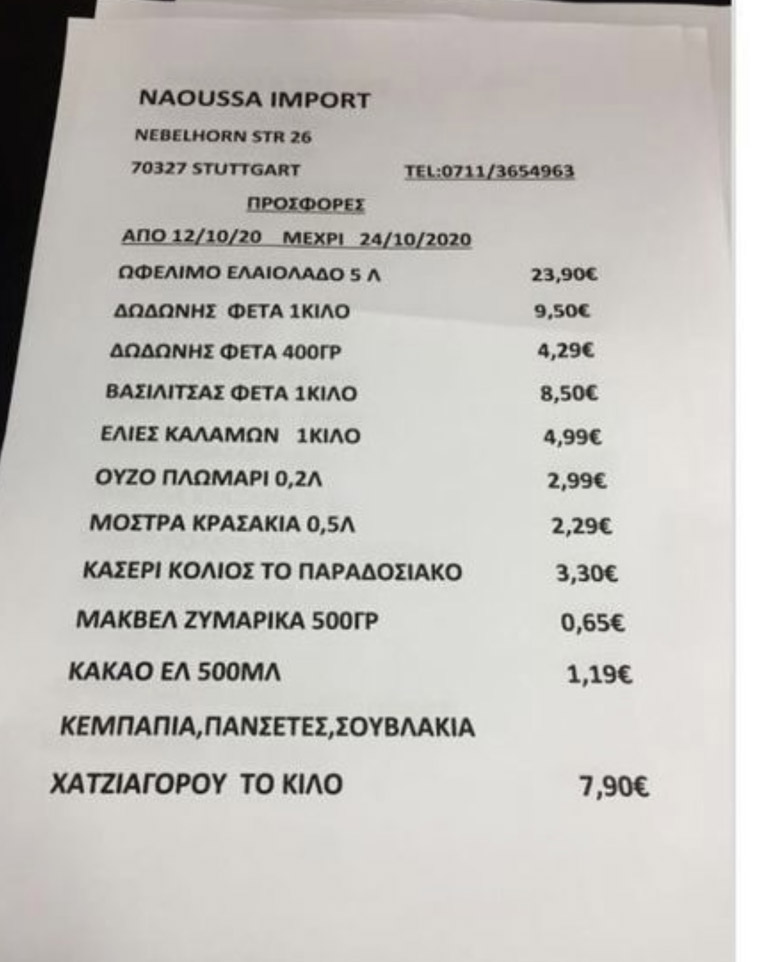 Υπάρχει, όμως, και κάτι πιο τραγικό σε όλη αυτή την τραγωδία, που λέγεται αύξηση τιμών στη Γερμανία, σε ελληνικά σούπερ μάρκετ πωλούνται τα ελληνικά προϊόντα που αγοράζουνε όλοι πιο φθηνά. Μια φέτα γνωστής εταιρείας στην Ελλάδα κοστίζει 9,94 το κιλό και στη Γερμανία 9,50 ευρώ.