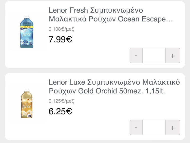Μεγάλη διαφορά στις τιμές, φυσικά, υπάρχουν και στα απορρυπαντικά, αλλά και στα μαλακτικά, καθώς ένα μαλακτικό στη Γερμανία κοστίζει 2,45 και το αντίστοιχο στην Ελλάδα 6,25. Τώρα, θα μου πεις, εκεί που πήγε το ρεύμα, τι το θες το πλυντήριο, αφήνεις τα ρούχα άπλυτα.