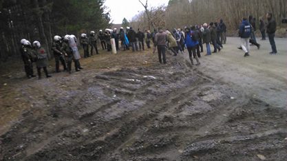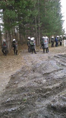 Όταν οι διαδηλωτές έφτασαν στην πύλη του εργοταξίου και άρχισαν να κρεμούν πανό, τα ΜΑΤ απάντησαν με χημικά.