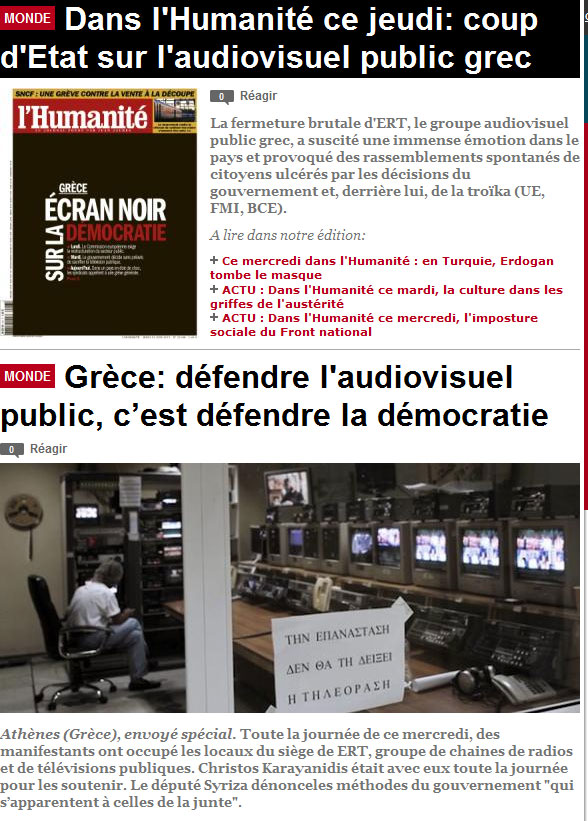 Πρωτοσέλιδο της «Libération» για την ΕΡΤ, Πρώτη καταχώρηση: Πέμπτη, 13 Ιουνίου 2013, 01:11