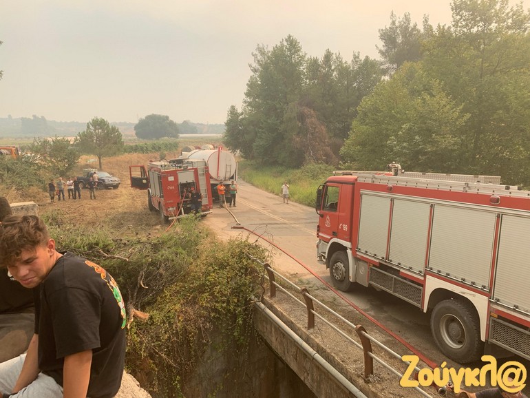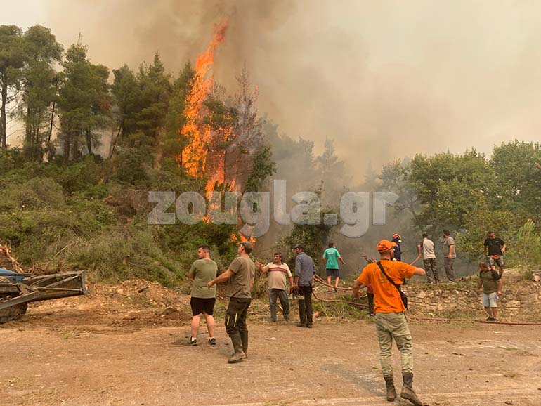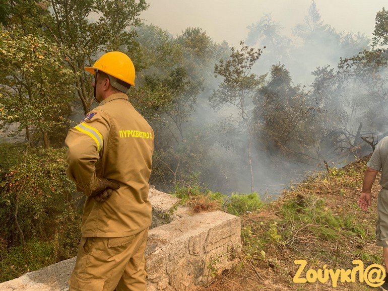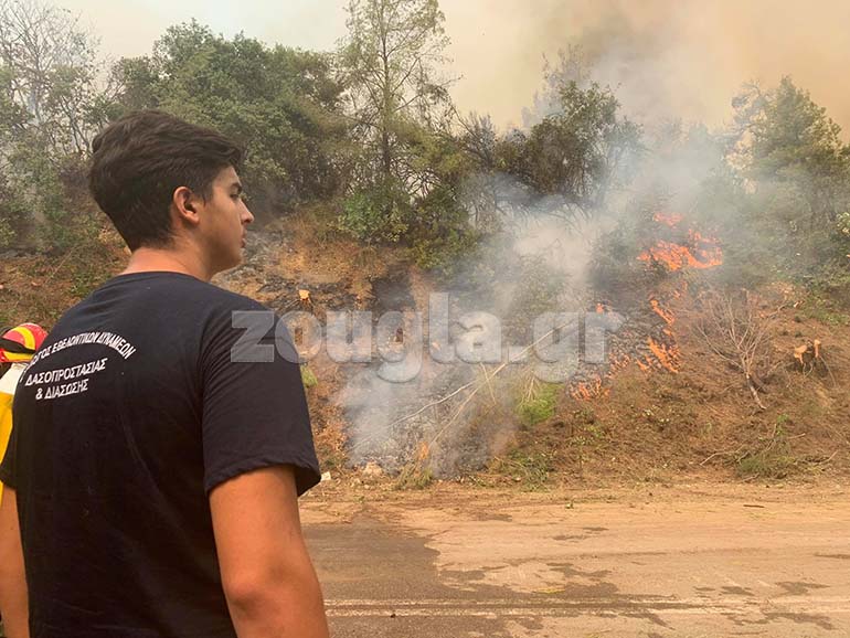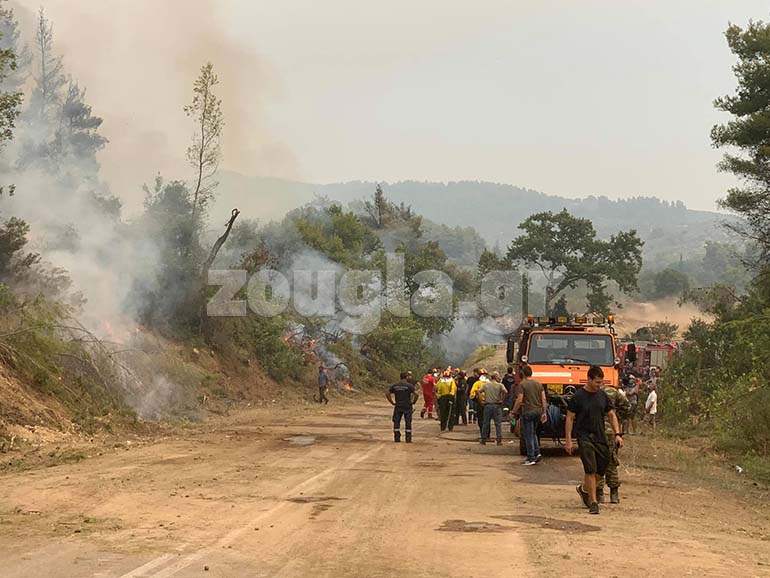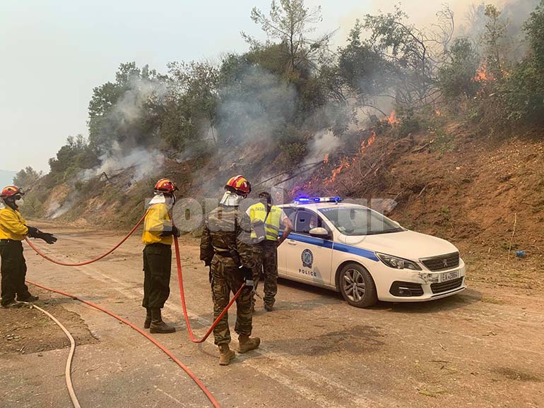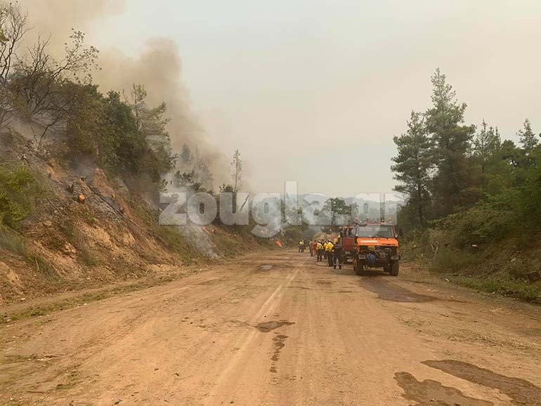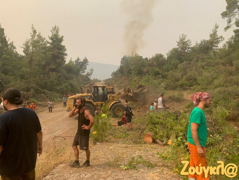 Την ώρα που το πύρινο μέτωπο πλησιάζει προς το χωριό Κεχριές, που εκκενώθηκε λίγο νωρίτερα, η πυροσβεστική και τα στελέχη της πυροσβεστικής υπηρεσίας δίνουν μάχη με τον χρόνο για να δημιουργήσουν αντιπυρικές ζώνες μέσα στο δάσος, στις παρυφές του οικισμού, ώστε να σωθεί το χωριό.