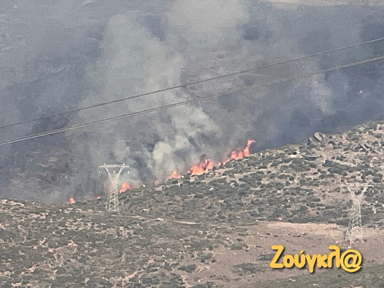 Στην περιοχή τώρα πνέουν άνεμοι 6-7 μποφόρ, οι οποίοι προκάλεσαν αναζωπυρώσεις της φωτιάς, η οποία κινείται με μεγάλη ταχύτητα.