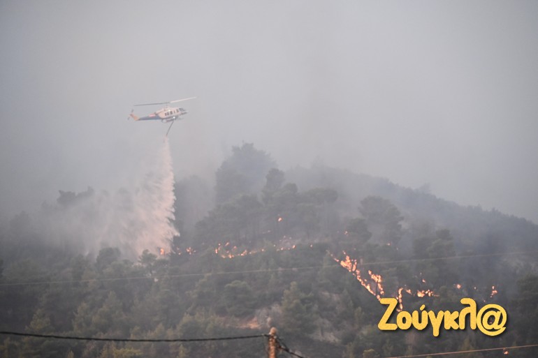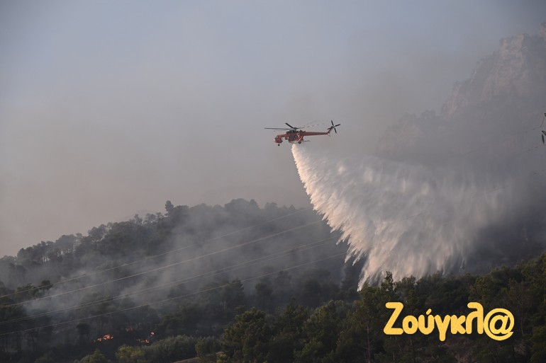 Οι επίγειες δυνάμεις έχουν καθηλωθεί, καθώς δεν μπορούν να πλησιάσουν εκεί που οι αναζωπυρώσεις γίνονται μέτωπα φωτιάς, ενώ οι εναέριες που παραμένουν στην περιοχή, δίνουν πραγματική μάχη σ’ ένα μέτωπο που προσεγγίζει τα 10 χιλιόμετρα.