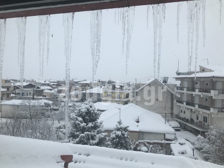 Έντονη είναι η χιονόπτωση και στην Ελασσόνα, με ισχυρό παγετό και ιδιαίτερα χαμηλές θερμοκρασίες να επικρατούν σε όλη την περιοχή.