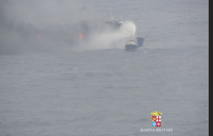 Οι πρώτες εικόνες από το φλεγόμενο πλοίο: