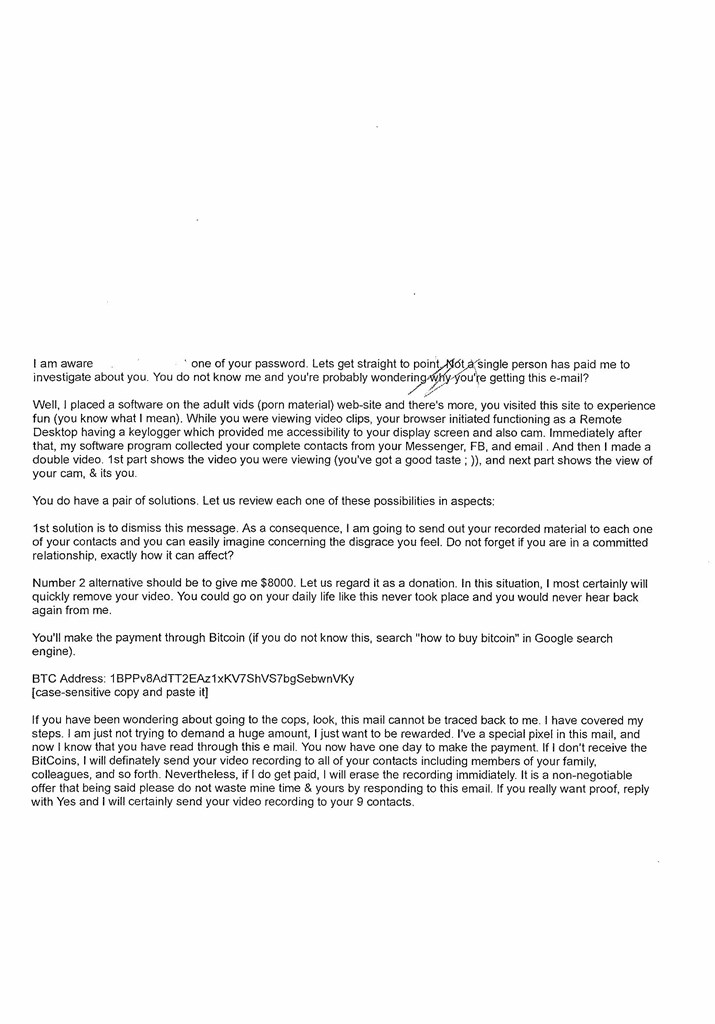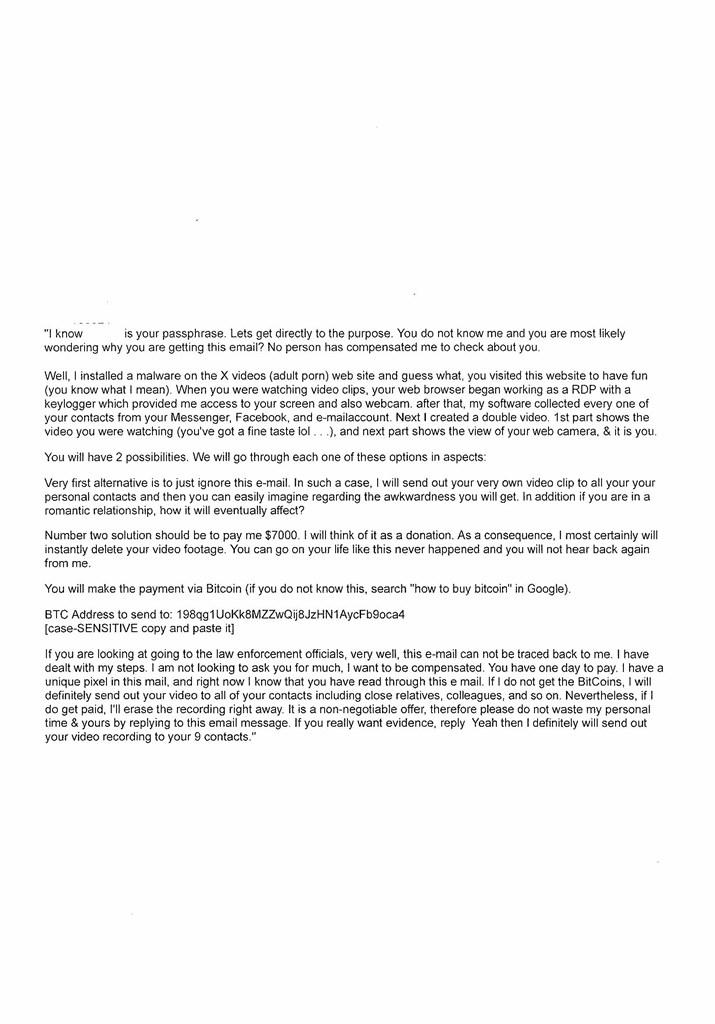 Στη συνέχεια αναφέρεται ότι το κακόβουλο λογισμικό έχει συλλέξει όλες τις επαφές των χρηστών από τα μέσα κοινωνικής δικτύωσης και οι δράστες απειλούν με την αποστολή του επίμαχου υλικού στις επαφές τους, σε περίπτωση που δεν λάβουν bitcoins.