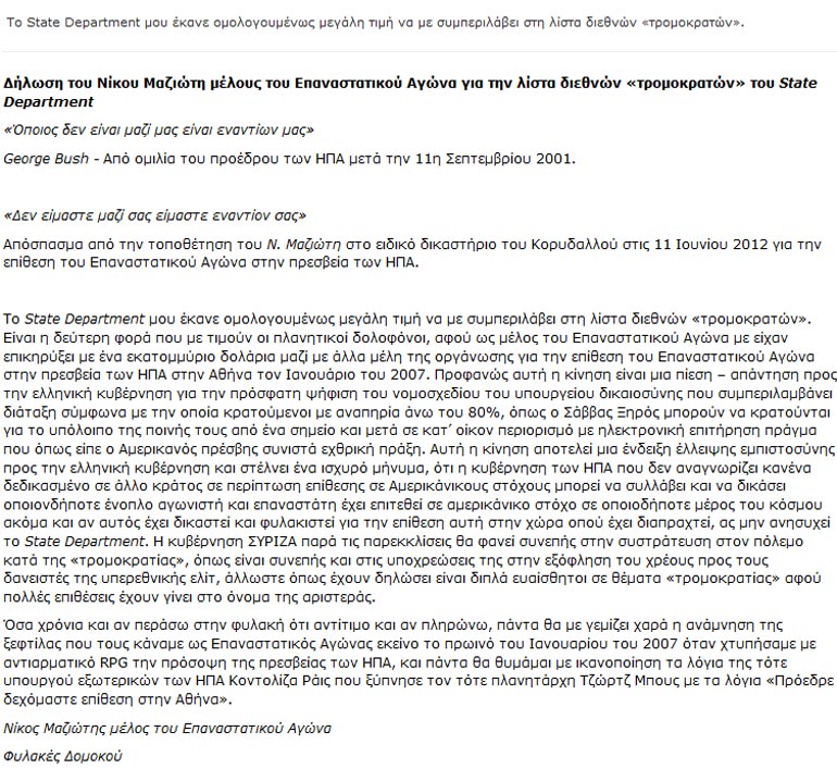 Κείμενο απάντησης στην λίστα διεθνών τρομοκρατών που ανακοίνωσε το Στέιτ Ντιπάρτμεντ και στην οποία περιλαμβάνεται και το όνομά του, έδωσε o Νίκος Μαζιώτης από τις φυλακές Δομοκού.