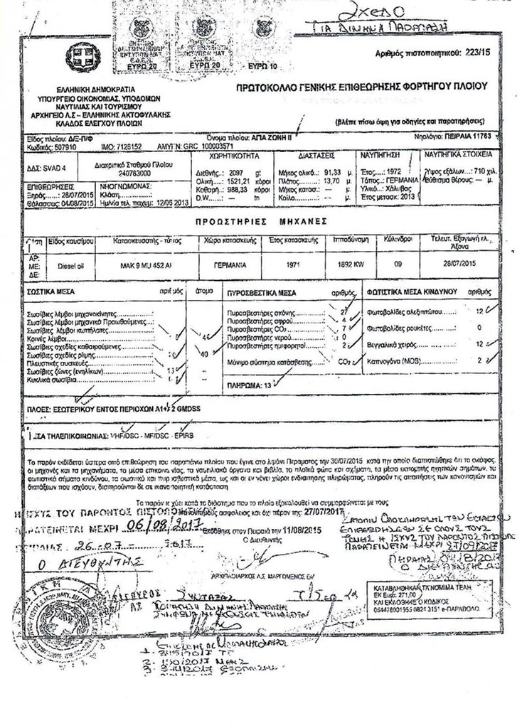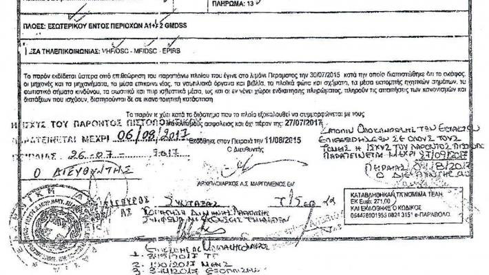 Όπως αποδεικνύεται από έγγραφο του Κλάδου Ελέγχου Πλοίων του Υπουργείου Ναυτιλίας, που αποκαλύπτει το πόρταλ «902.gr», το πιστοποιητικό αξιοπλοΐας του πλοίου είχε λήξει στις 27 Ιούλη και είχε λάβει παράταση για δύο μήνες.