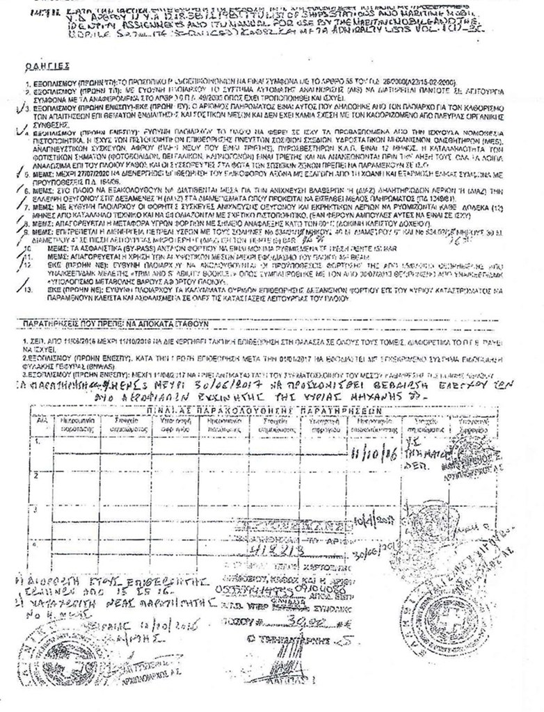 Το πρωτόκολλο έληξε στις 27 Ιούλη του 2017, χωρίς να αναφέρεται αν είχαν αποκατασταθεί οι παρατηρήσεις αυτές και αν έχει γίνει εκ νέου επιθεώρηση ώστε να καταγραφούν τυχόν νέα προβλήματα. Ωστόσο, εκδόθηκε παράταση του πιστοποιητικού έως τις 6 Αυγούστου του 2017 και στη συνέχεια «έρχεται» νέα παράταση που έληγε στις 27 Σεπτέμβρη του 2017. Η παράταση δεν πρόλαβε να ολοκληρωθεί και το πλοίο ναυάγησε στις 10 Σεπτέμβρη, προκαλώντας την τεράστια ζημιά στο Σαρωνικό.