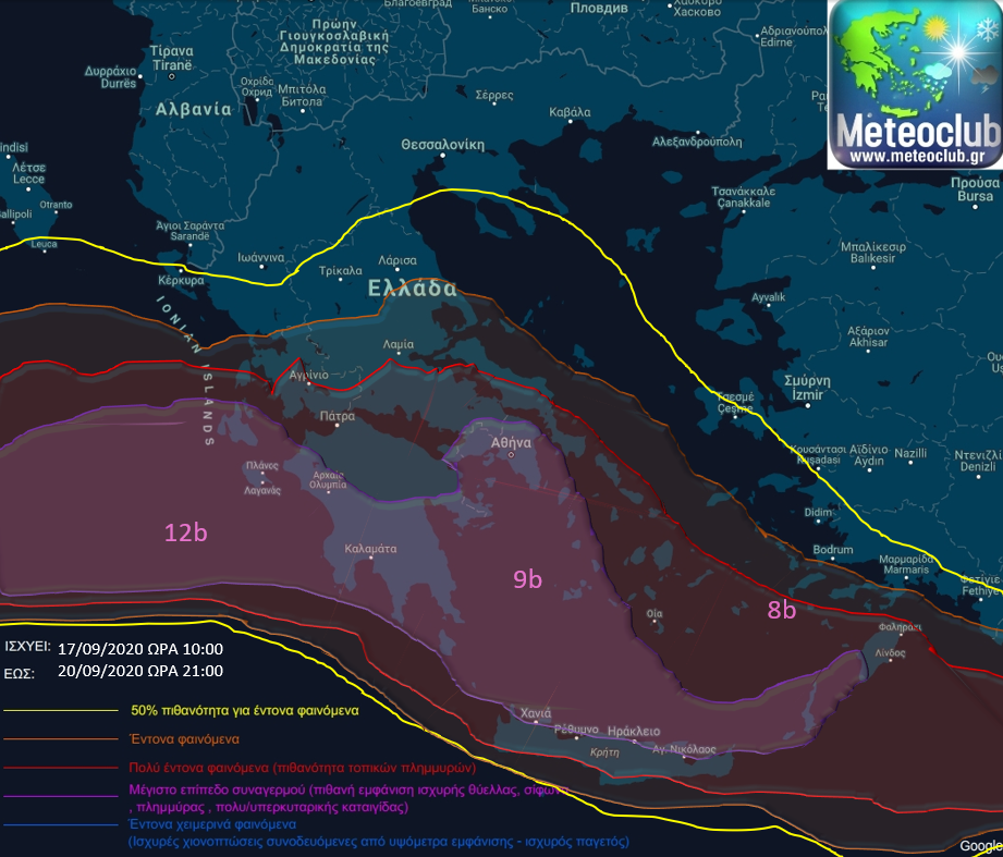 Στον παρακάτω χάρτη μπορείτε να δείτε προειδοποιήσεις έντονων φαινομένων για την ελληνική επικράτεια μέχρι τις 20 Σεπτεμβρίου με τα μέχρι στιγμής δεδομένα. Αυτό σημαίνει πως ο χάρτης μπορεί να αλλάξει.